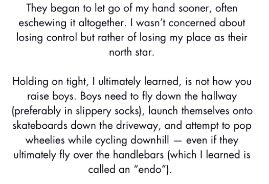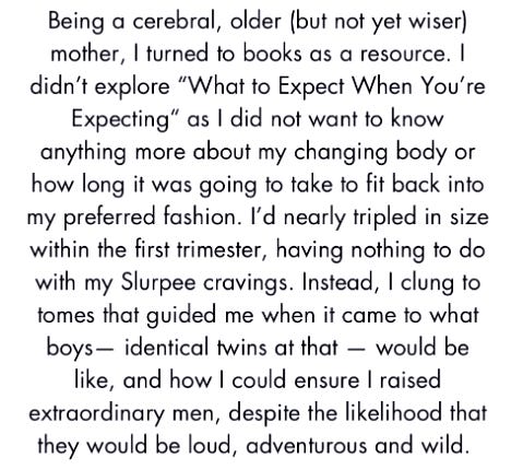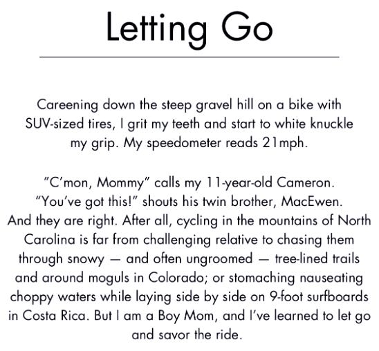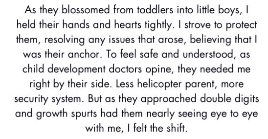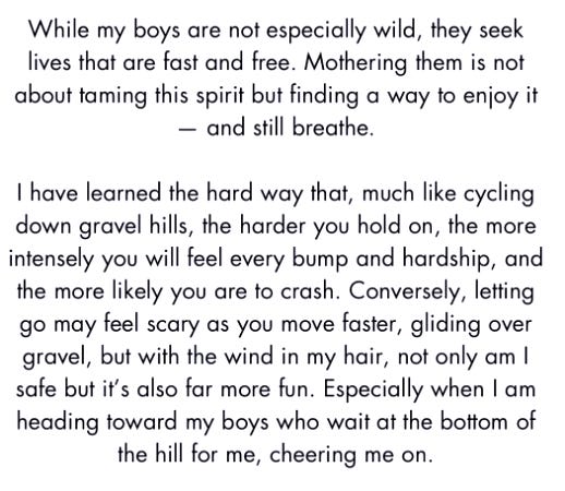 While revisiting the essay I contributed to the anthology “Boy Moms: Collective Tales of Mothers and Sons” a few years ago — apropos as today is Mother’s Day — it struck me that while learning to let go has been invaluable in parenting, as we grow older the concept becomes an even more profound lesson. Letting go of youthful obsessions, unattainable ideals, or the need for external validation allows us to embrace something far greater — peace within ourselves. With each passing year, I find letting go — which is very different from letting ourselves go — is a quiet rebellion against societal pressures, a way of reclaiming our essence from the clutches of superficiality. It is in this release that we find a deeper connection to our true selves and to the world around us.